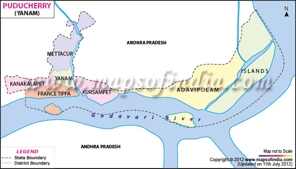 Yanam: Total area: 20 Sq. Kms. Yanam is surrounded by East Godavari district of Andhra Pradesh. The region is bounded on the East and South by River Godavari which discharges itself into the Bay of Bengal after flowing about 14 Km. towards South – east. The town of Yanam is located at a